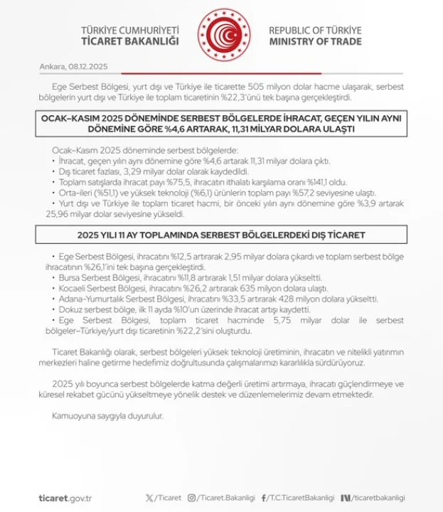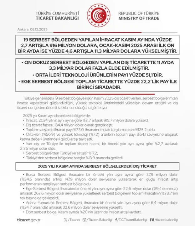 Ayrıca Ocak–Kasım 2025 dönemini kapsayan ilk 11 ayda serbest bölgelerin ihracatı, %4,6’lık bir artışla 11,3 milyar dolara kadar yükseldi. Bu artış, serbest bölgelerin dış ticaretteki stratejik önemini bir kez daha ortaya koydu.