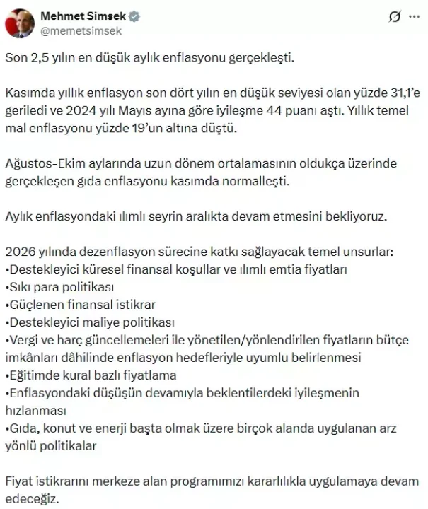 Bakan Şimşek, X platformundan yaptığı açıklamada kasım ayı verilerinin dezenflasyon sürecindeki olumlu gidişatı desteklediğini vurguladı: