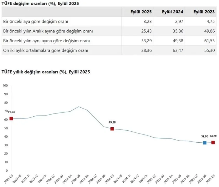Türkiye İstatistik Kurumu (TÜİK), 2025 yılı eylül ayı enflasyon rakamlarını açıkladı. Tüketici Fiyat Endeksi (TÜFE) eylülde aylık bazda yüzde 3,23 artarken, yıllık enflasyon yüzde 33,29 olarak gerçekleşti. Böylece eylül enflasyonu piyasa beklentilerini aşmış oldu.