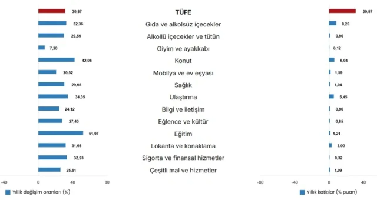 Yıllık bazda, konut, su, elektrik, gaz ve diğer yakıtlar grubunda yaşanan yüzde 42,06’lık artış, en yüksek artış olarak kaydedildi. Ulaştırma grubunda yıllık artış yüzde 34,35, gıda ve alkolsüz içeceklerde ise yüzde 32,36 olarak gerçekleşti. Bu üç ana harcama grubunun yıllık enflasyona katkısı sırasıyla; gıda için 8,25 puan, ulaştırma için 5,45 puan ve konut için ise 6,04 puan oldu.