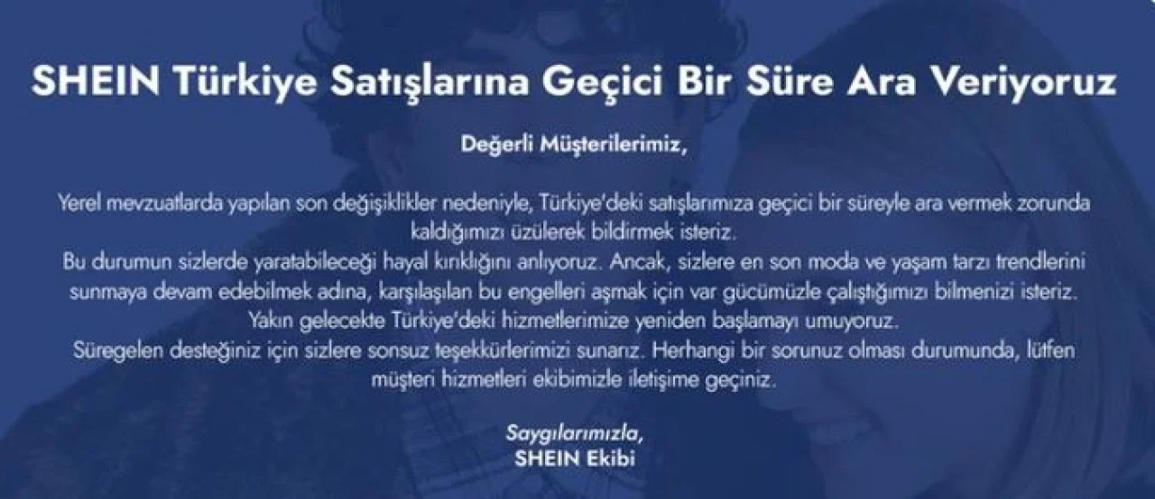Shein tarafından yapılan açıklamada şu ifadelere yer verildi: Yerel düzenlemelerdeki güncellemeler nedeniyle Türkiye’deki satışlara geçici olarak ara verilmek zorunda kalındığı belirtilirken, kullanıcıların yaşayabileceği memnuniyetsizliğin farkında olunduğu ifade edildi. Şirket, moda ve yaşam tarzı ürünlerini sunmaya devam edebilmek için tüm engelleri aşmaya yönelik çalışmaların sürdüğünü ve yakın gelecekte Türkiye’deki hizmetlerin yeniden başlatılmasının hedeflendiğini açıkladı.