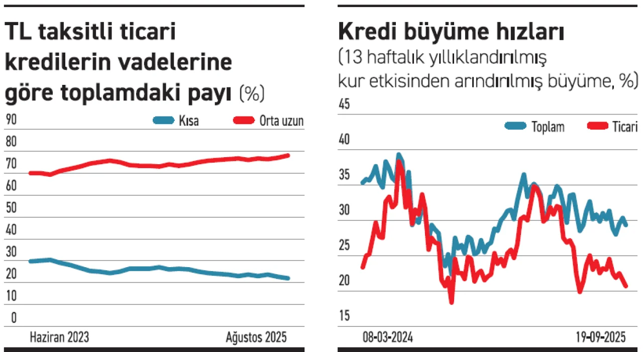Bankacılık Düzenleme ve Denetleme Kurumu (BDDK) verilerine göre, Haziran 2023’te TL cinsi sabit faizli taksitli ticari kredilerin yüzde 30’a yakını kısa vadeli iken bu oran Ağustos 2025 itibarıyla yüzde 21,7’ye kadar geriledi. Aynı dönemde orta ve uzun vadeli kredilerin payı yüzde 70’ten 78’in üzerine kadar çıktı.