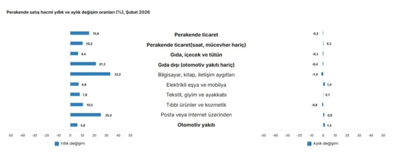 Aynı dönemde sektörler arasında farklı eğilimler ön plana çıktı. Motorlu kara taşıtları ve motosikletlerin ticareti ile onarım faaliyetlerinde satış hacmi yüzde 1,5 oranında gerilerken, toptan ticarette de sınırlı bir düşüş yaşandı (%0,1). Buna karşılık perakende ticaret satış hacmi yüzde 15,6 artarak genel tabloyu yukarı taşıyan en güçlü kalem oldu.