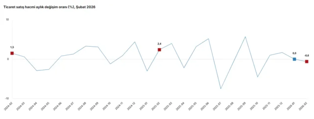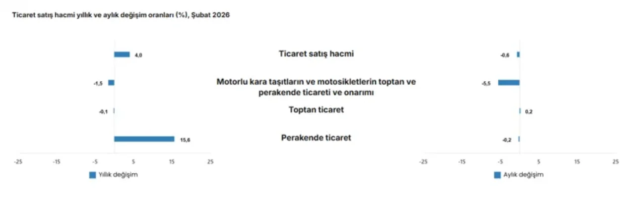Şubat ayında aylık bazda ise ticaret satış hacminde hafif bir düşüş kaydedildi. Bir önceki aya göre toplam ticaret satış hacmi yüzde 0,6 azalırken, motorlu taşıtlar ve motosiklet grubunda bu düşüş yüzde 5,5 olarak gerçekleşti.