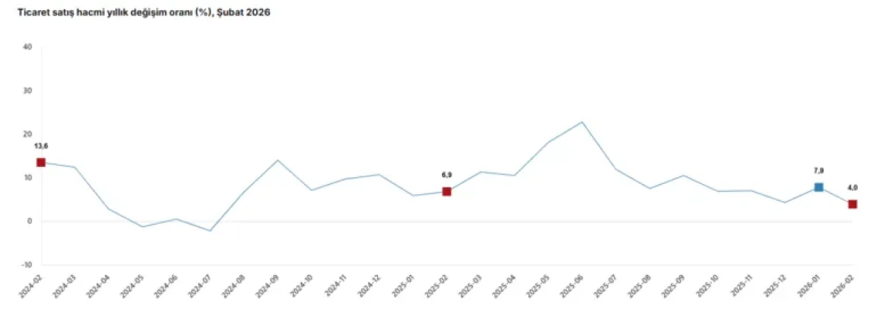 Türkiye genelinde ticaret satış hacmi yıllık bazda artış gösterirken, perakende sektöründeki yükseliş dikkat çekti. Türkiye İstatistik Kurumu (TÜİK) tarafından yayımlanan son verilere göre, 2026 yılı Şubat ayında ticaret satış hacmi geçen yılın aynı dönemine kıyasla yüzde 4,0 oranında arttı.