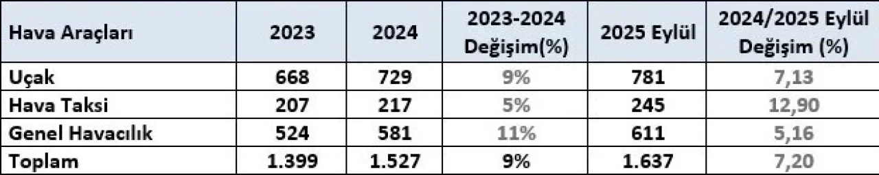 Sivil Havacılık Genel Müdürlüğü (SHGM) verilerine göre 2025 Eylül itibarıyla Türkiye’de toplam 1.637 hava aracı bulunuyor. Bunların 781’i uçak, 245’i hava taksi, 611’i genel havacılık kategorisinde yer alıyor.